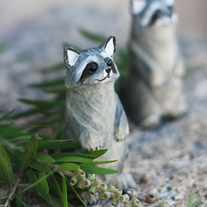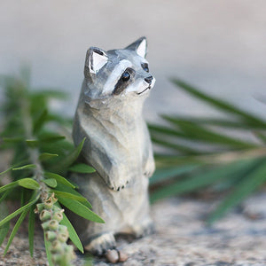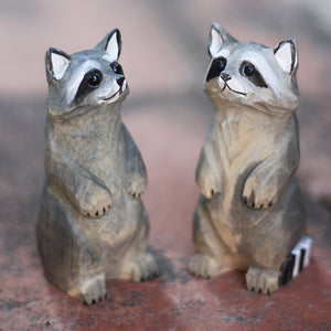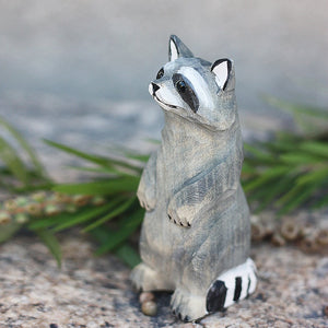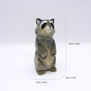 Introducing our hand carved wooden raccoon figurine, perfect for bookshelf decor and home decoration enthusiasts. Made by skilled craftsmen with a love for wood carving, this raccoon ornament adds a touch of playful charm to any space. Measuring X inches in height, this handmade wooden raccoon is a wonderful gift idea for raccoon lovers and collectors alike. Display it on your bookshelf or mantlepiece, and watch the intricately carved details come to life. Bring a bit of the natural world into your home with this charming raccoon figurine, expertly crafted to capture the essence of this beloved creature.
